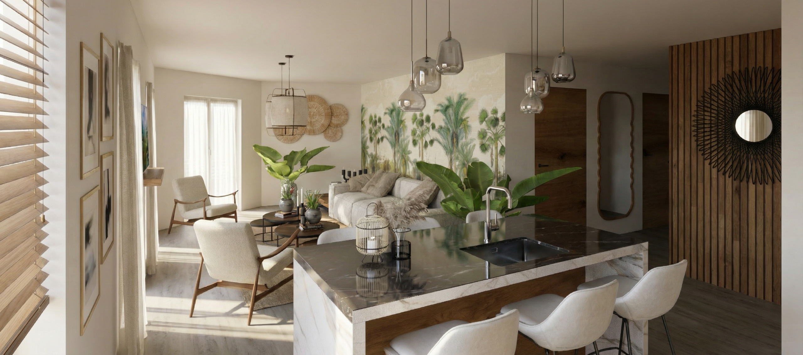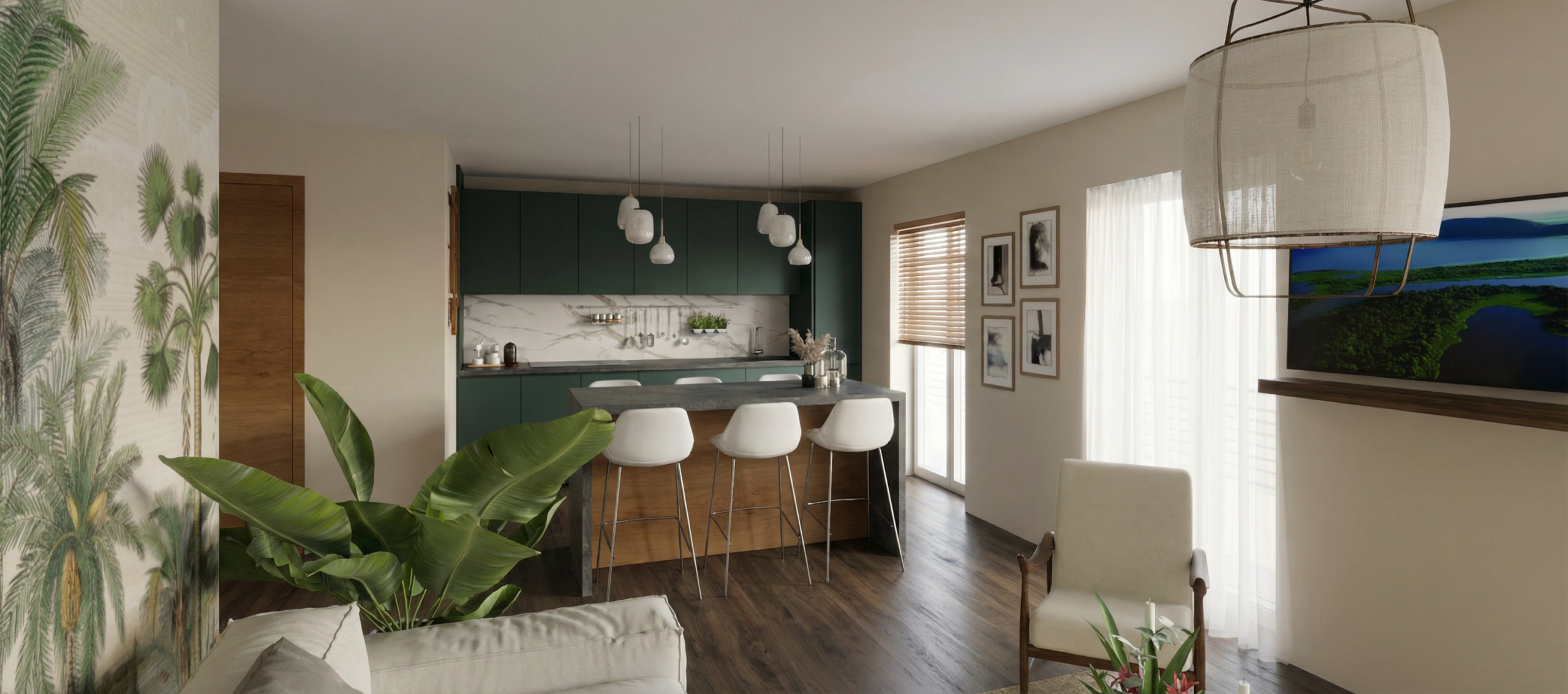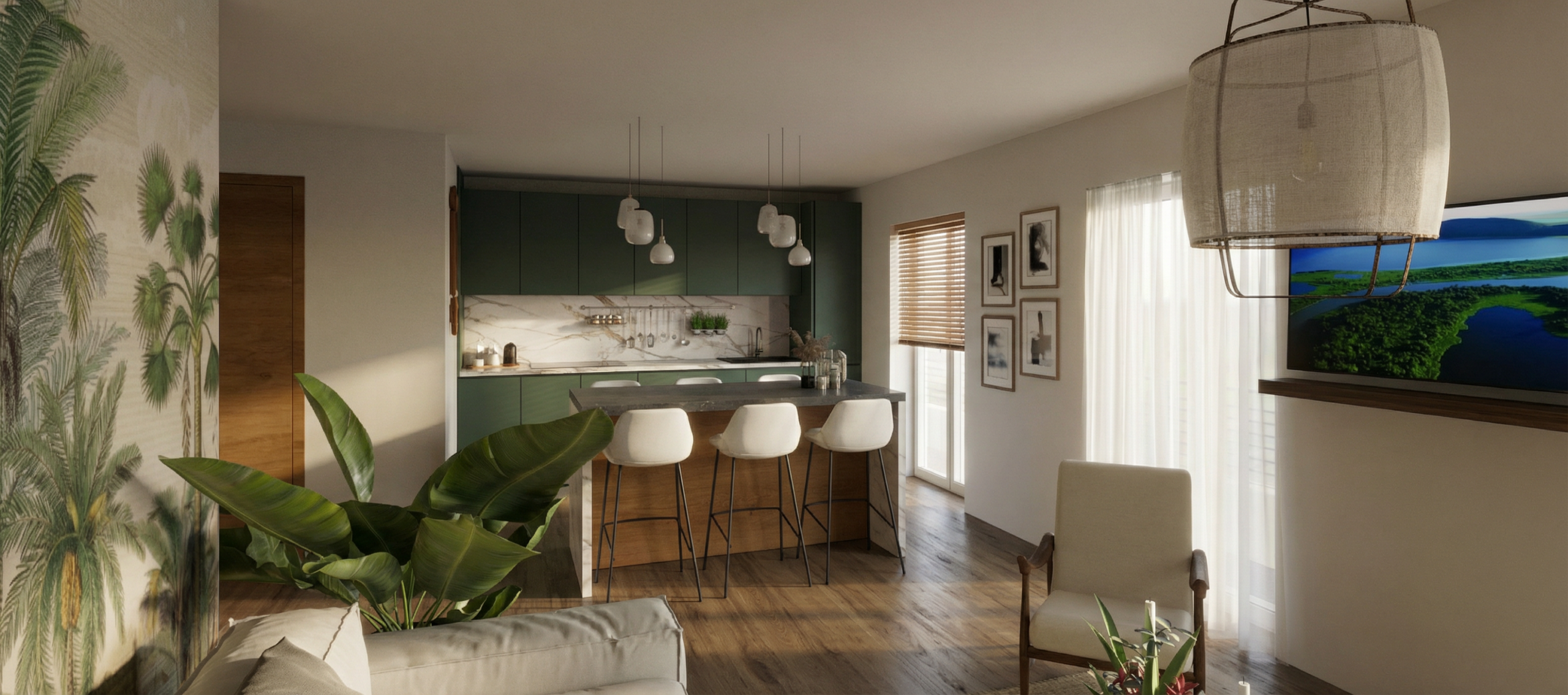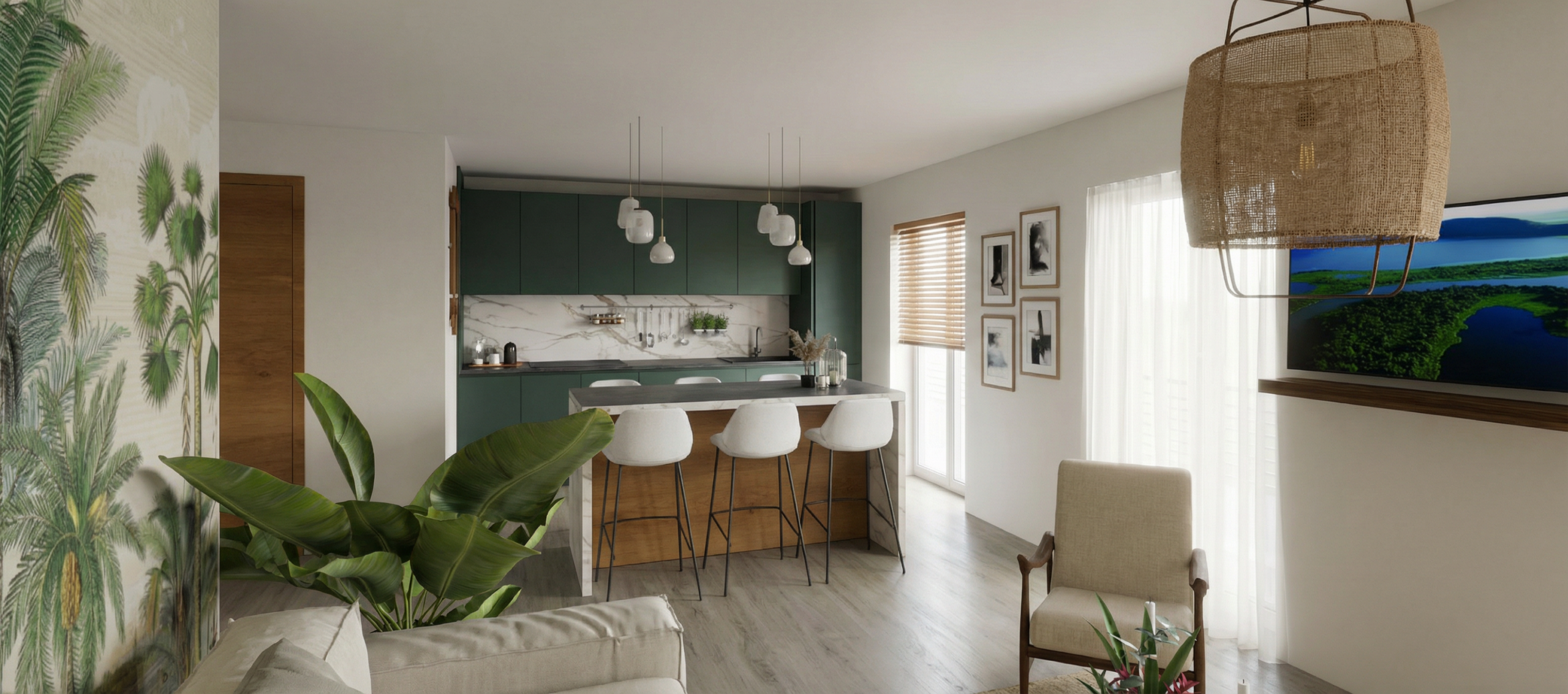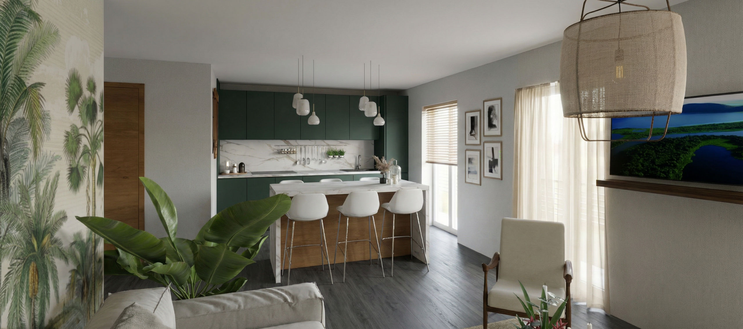 La Cride se situe au deuxième étage, cet appartement respire le grand air, teintes verdoyantes, tapisserie évocatrices, couleurs soigneusement choisis pour des moments de tranquillité et de sérénité.